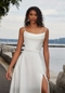 Clean and contemporary, our Nike designer wedding dress features luxe soft satin in a flowing A-line silhouette. Modern details like the draped cowl neckline and cool, detachable off-the-shoulder sleeves elevate the gown, while the front skirt slit and open back show off the perfect amount of skin. Shown in Ivory.
