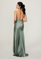Silky satin bridesmaids dress with cowl neckline, open strappy back, and bias-cut skirt.