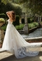 The soft net A-line features a chantilly lace bodice with spaghetti straps and illusion back.