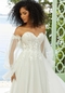 The tulle A-line features a bustier bodice with a sweetheart neckline and detachable long pouf sleeves.