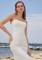 Swirling crystal beaded, frosted embroidery has an elegant embossed effect on our Pura designer wedding dress. The sophisticated fit and flare has a strapless neckline with a textured edge from the gorgeous appliqués with an illusion back revealing couture boning. The sleek crepe gives the gown a streamlined look, while the cut-away lace train is a romantic touch. Pair the dress with detachable bell sleeves for more of a boho vibe. Shown in Ivory/Honey.