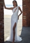 Glamorous and gilded, our Portia designer wedding dress serves unreal sparkle in allover beaded net. The sexy fit and flare has a one-shoulder neckline with a daring cutout in the center of the chest. The wrap-style skirt reveals a sultry pop of leg for an unexpected and dramatic gown. Shown in Ivory.