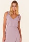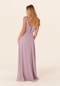 Flowing chiffon bridesmaid dress has a simple v-neckline and bow sleeves with a front skirt slit.