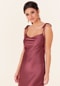 Luminous luxe satin bridesmaid dress has a simple sheath silhouette with tied tassel sleeves.