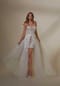 Unique mini dress has romantic frosted, 3D lace over sparkle tulle. Detachable tulle overskirt and bell sleeves give you two looks in one.