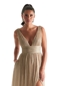 Iridescent bridesmaid dress is stunning pleated shimmer fabric has an open v-neckline that highlight the decolletage and a square back. The ruched waist helps to create a flattering shape on the A-line silhouette and front skirt slit adds more movement. Shown in Gold.