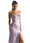Chic bridesmaid dress hugs your curves in a fit and flare silhouette with a beautiful bow detail on the strapless neckline. Contoured seams enhance your silhouette and a front skirt slit for added movement. Shown in Violet.