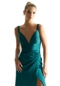 Stunning bridesmaid dress in luminous luxe satin has a pleated bust and draped waist creating an empire bodice with a sultry open neckline. The skirt has a faux-wrap effect creating a flattering drape and a front skirt slit for a pop of leg. Shown in Teal.