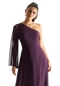 Sophisticated bridesmaid dress features a one-shoulder neckline with a sheer long sleeve that floats around the arm. The A-line skirt creates a full silhouette with a tie-back sash to help cinch in your figure. Pockets on the faux-wrap skirt are a fun addition. Shown in Eggplant.