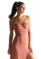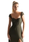 Trendy bridesmaid dress has a sweetheart neckline with a draped bust on a corset boned bodice. The A-line skirt softly floats off the body with a front slit for added movement. Get two looks in one with the ruched detachable cap sleeves. Shown in Spice.