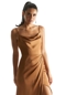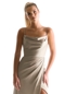 Classic bridesmaid dress has a soft cowl neckline on the simple bodice with a faux-wrap skirt that has a delicate drape for a flattering silhouette. The front skirt slit creates a sultry pop of leg on the luxe satin dress. Shown in Latte.