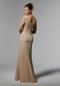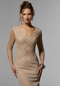 Sparkling sheath evening gown has a v-neckline and matching v-shaped back with dazzling crystal beading that criss crosses the bodice and decorates the sheer three-quarter length sleeves. The stretch crepe skirt has a simple clean shape for a polished look.