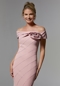 Modern mermaid evening gown features a cuffed, off-the-shoulder neckline with a textured rosette detail. The chic linear beading created clean lines on the fitted silhouette that hugs your curves in structured crepe.