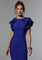Understated stretch crepe evening gown has a modest bateau neckline and subtle v-shaped back on a fit and flare silhouette featuring a banded waist to define your figure. Perfectly places seams give you a long and lean look with the dramatic flare out the flounced short sleeves.