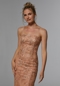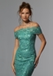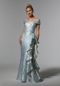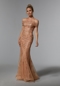 Luxe fit and flare features floral frosted, embroidered net over glitter net with crystal beaded for an extra pop of sparkle. The fitted gown hugs your curves with a clean straight, strapless neckline with a detachable stole for an off-the-shoulder look.