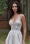 Our Paladia designer wedding dress is an elegant A-line featuring delicately beaded, embroidered lace appliqués the softly float down the gown from the sheer boned bodice. We love how sultry elements, like the open back and front skirt slit, contrast the feminine details of the waistline bow and three-dimensional flowers. Shown in Ivory/Champagne/Honey.