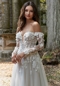 Our Priya designer wedding dress is a fairytale-inspired A-line featuring whimsical floral details. The plunging sweetheart bodice features sheer ruching over couture boning with stunning crystal beaded, three-dimensional floral lace appliqués. Soft tulle floats off the body for an effortless and ethereal look with matching detachable long sleeves to add to the fantasy. Shown in Ivory/Champagne/Honey.