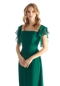 Lovely bridesmaid dress feels effortless in chiffon fabric with a chic straight neckline on a delicately draped bodice. The ruffled sleeves add a coquettish look and the lightweight A-line skirt floats off the body. Shown in Emerald.