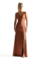 Stunning bridesmaid dress glows in luxe satin fabric on an effortless A-line silhouette. The strapless sweetheart neckline has a twisted detail with ruching for added texture. The bodice has defined seaming for a sleek and structured look. Shown in Spice.