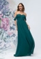 This A-line chiffon bridesmaid dress features a ruched sweetheart bodice that flatters the figure, complemented by softly draped off-the-shoulder sleeves for a touch of romantic sophistication. A defined banded waist defines the silhouette, while the flowing skirt moves gracefully with every step.