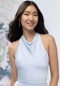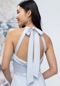 This luxe satin sheath bridesmaid dress features a sleek halter neckline and an open keyhole back accented by a soft tie bow for a touch of feminine charm. A graceful cowl detail adds fluidity and movement, creating a look that's effortlessly polished and elegantly understated.