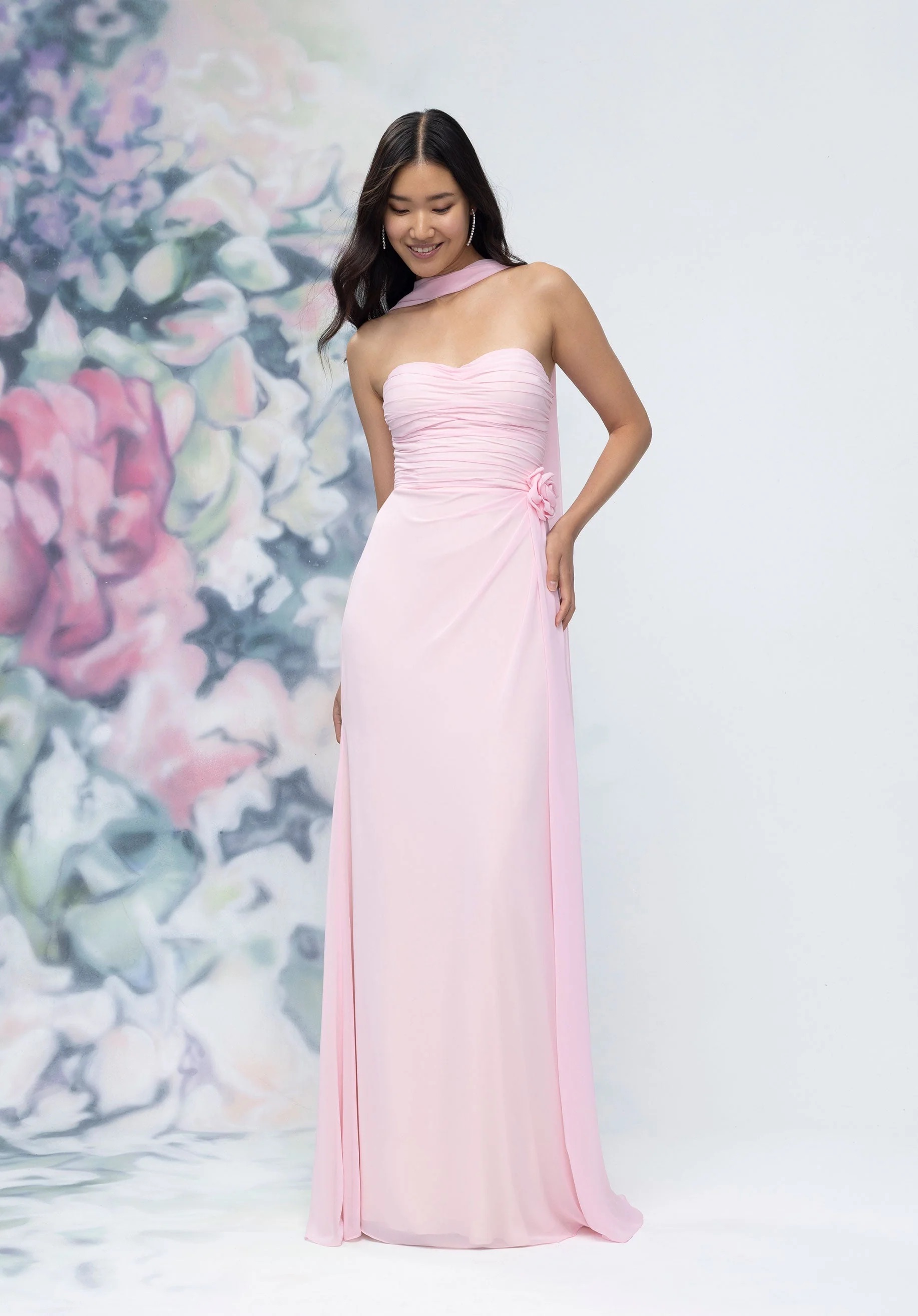 This chiffon bridesmaid dress features a soft sweetheart neckline on a strapless draped bodice that flatters with romantic ease. Detachable 3D rosette detailing and a coordinating neck scarf offer versatile styling moments, allowing for a look that's effortlessly cool with a hint of playful charm.