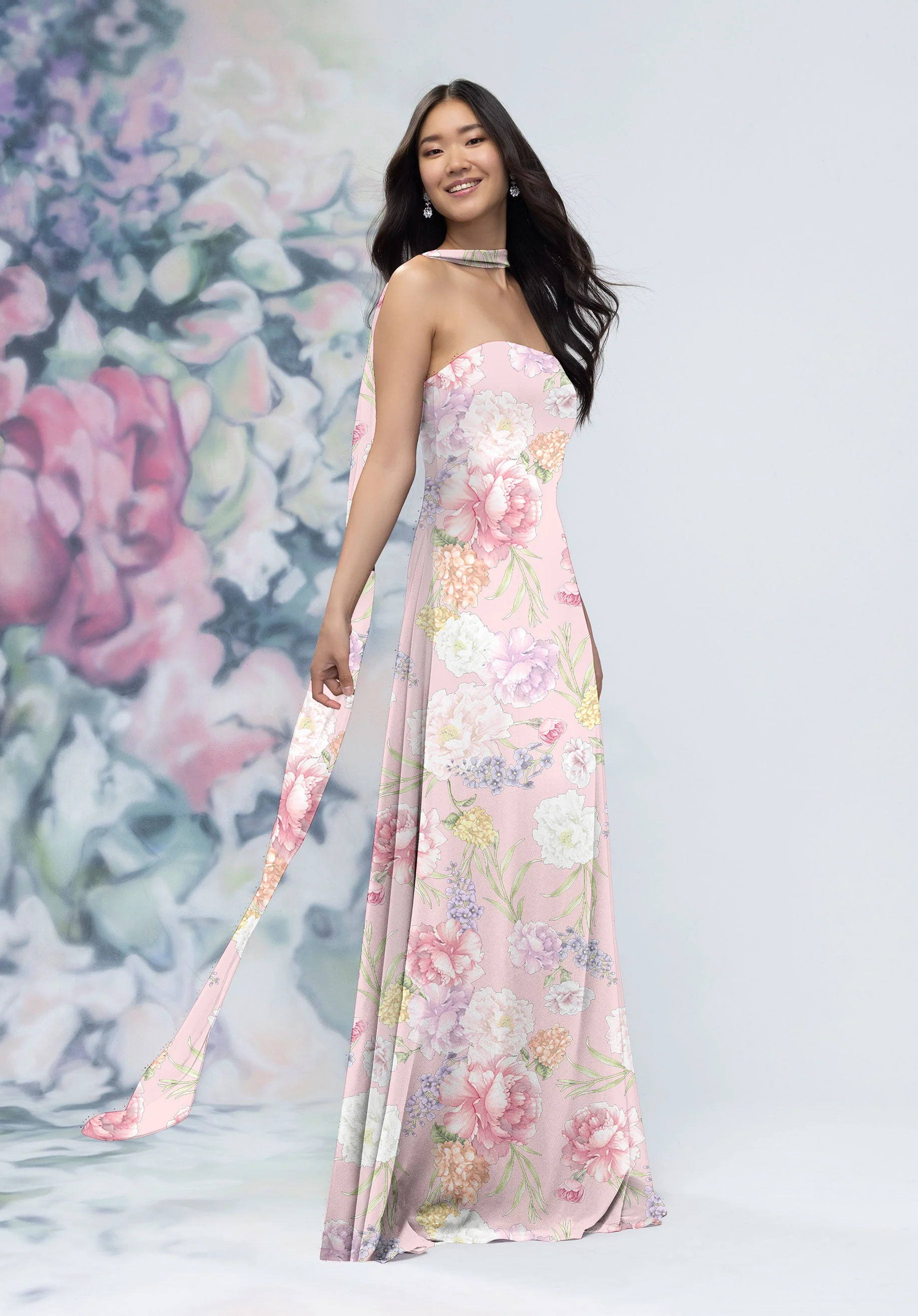 This flared column bridesmaid dress features a clean strapless straight neckline that highlights the shoulders with effortless elegance. Crafted in floral printed chiffon, it's paired with a detachable neck scarf for versatile styling and a soft, feminine finish for a timeless silhouette with a fresh, modern feel.