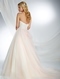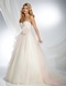 Layers upon layers of gossamer tulle delicately drape this ball gown into a dreamy confection fit for any princess. The strapless bodice has been highlighted with crystal beaded lace and a handmade flower reminiscent of Briar Rose. This soft and romantic gown is finished with a full chapel train.