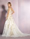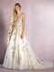 Romantic and ethereal soft A-line gown featuring diaphanous layers of tulle and shimmer tulle that have been dramatically adorned throughout with trailing tendrils of delicately beaded lace. Narrow shoulder straps and a sweetheart neckline add unconventional whimsy while the entire neckline is accented with elaborate crystal and metallic beading. The full sweeping skirt features soft feminine godets and is finished with a chapel length train.