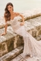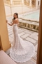 Stunning from afar and breathtaking up close, this opulent mermaid gown is simply irresistible. The semi-sheer bodice and elegantly draped lace applique straps highlight and enhance your curves to create a gorgeously feminine silhouette. A Cathedral train completes this breathtaking gown, ensuring your bridal style is etched in your guests' memory long after the vows are exchanged.
