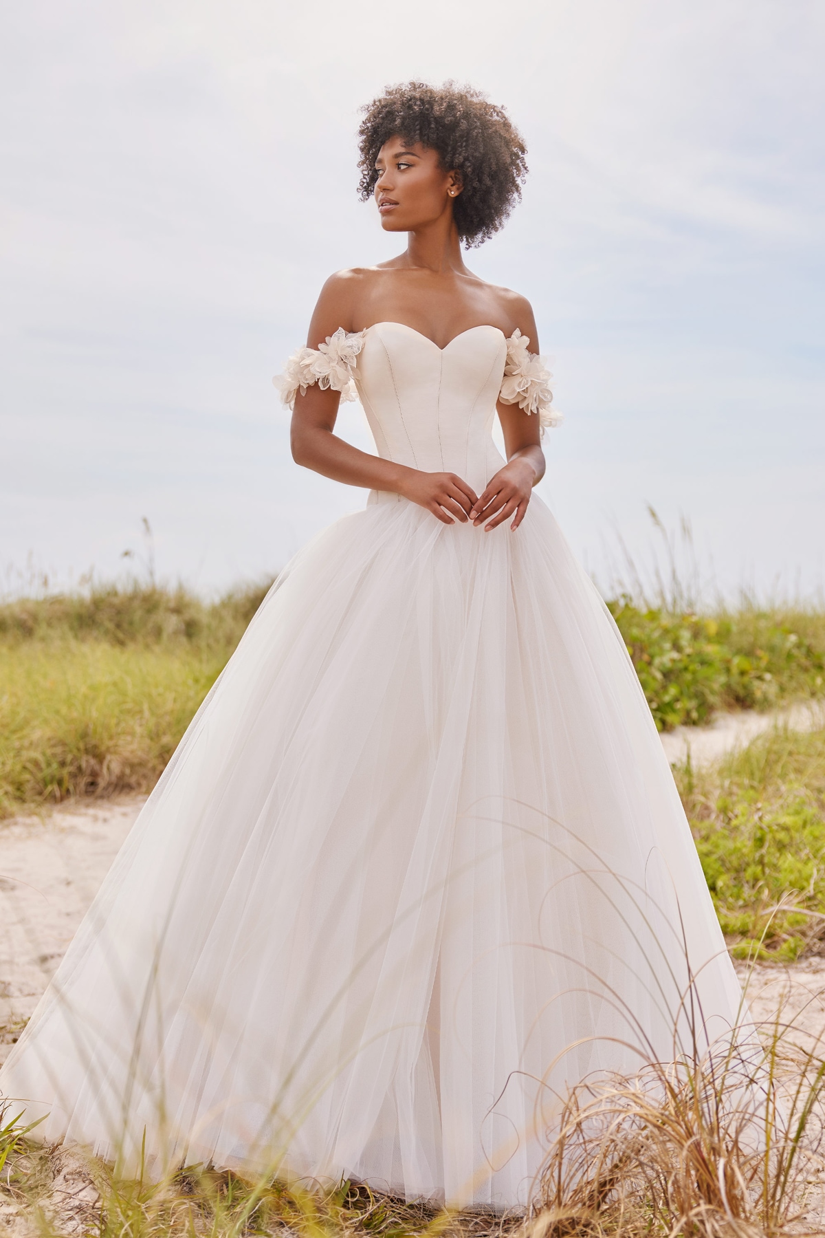 Bring your fairytale to life in this dreamy ball gown. The ultra-flattering sweetheart neckline and thoughtful line elements accentuate and support your curves, while the softly draped floral-inspired sleeves leave a gorgeously romantic impression. Exquisite 3D-floral detailing adds a whimsical touch to the dramatic full skirt to create a one-of-a-kind bridal style that is simply captivating.