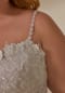 Ethereal A-line has delicate crystal beaded, 3D floral lace on deep v-neck bodice and pleated tulle skirt with a dainty tie-back detail.