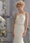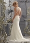 Look svelte and sophisticated in this fabulous gown from the Mori Lee Bridal Collection. A tantalizing illusion scoop neckline engulfs a soft sweetheart bodice. The sleeveless bodice is bordered by the dazzling glitter of diamante beading. Poetic lace cloaks the length of the gown, even as the waist is prominently defined by a band of diamante beading. The silhouette follows the natural curves of the bust, waist and hips and slightly flares into a soft A-line skirt with a sweeping train at the end. The fabulous dress features a unique and stunning design at the back, with the straps closing high to reveal a gorgeous inverted V that is open all the way to the waistline. The gown also includes a removable sash that can be used to highlight the waist. It further extends into a short band of fabric buttons at the derriere.