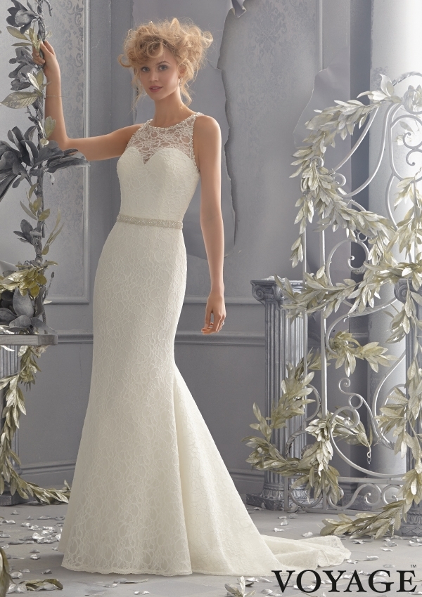 Mori Lee Voyage FALL 2014 Collection: 6784 - Diamante Beading Trims this Poetic Lace Bridal Gown Gown