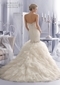 This exciting bridal gown from Mori Lee is available in white/silver and ivory/silver combinations. The fully ruffled mermaid skirt and sculpted bodice will emphasize your curves; so this design will suit tall brides and those with well-toned figures. The sweetheart neckline adds softness to the face and is ideal for brides with angular faces. The overall effect of this gown is phenomenal and donning it will transform you into a breathtaking beauty. Make this unconventional, magnificent gown your own and step up the style factor at your wedding to make it memorable!