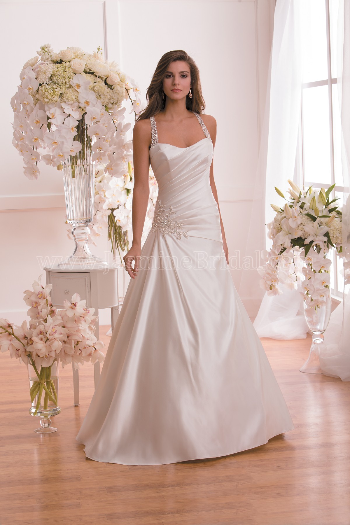 L'eclat satin is the main feature of this radiant wedding gown. The asymetrically ruched satin and ball gown skirt make for a simple, but elegant design, letting the fabric speak for itself. The dress also features beautifully beautifully beading on its halter straps and on the right hip.