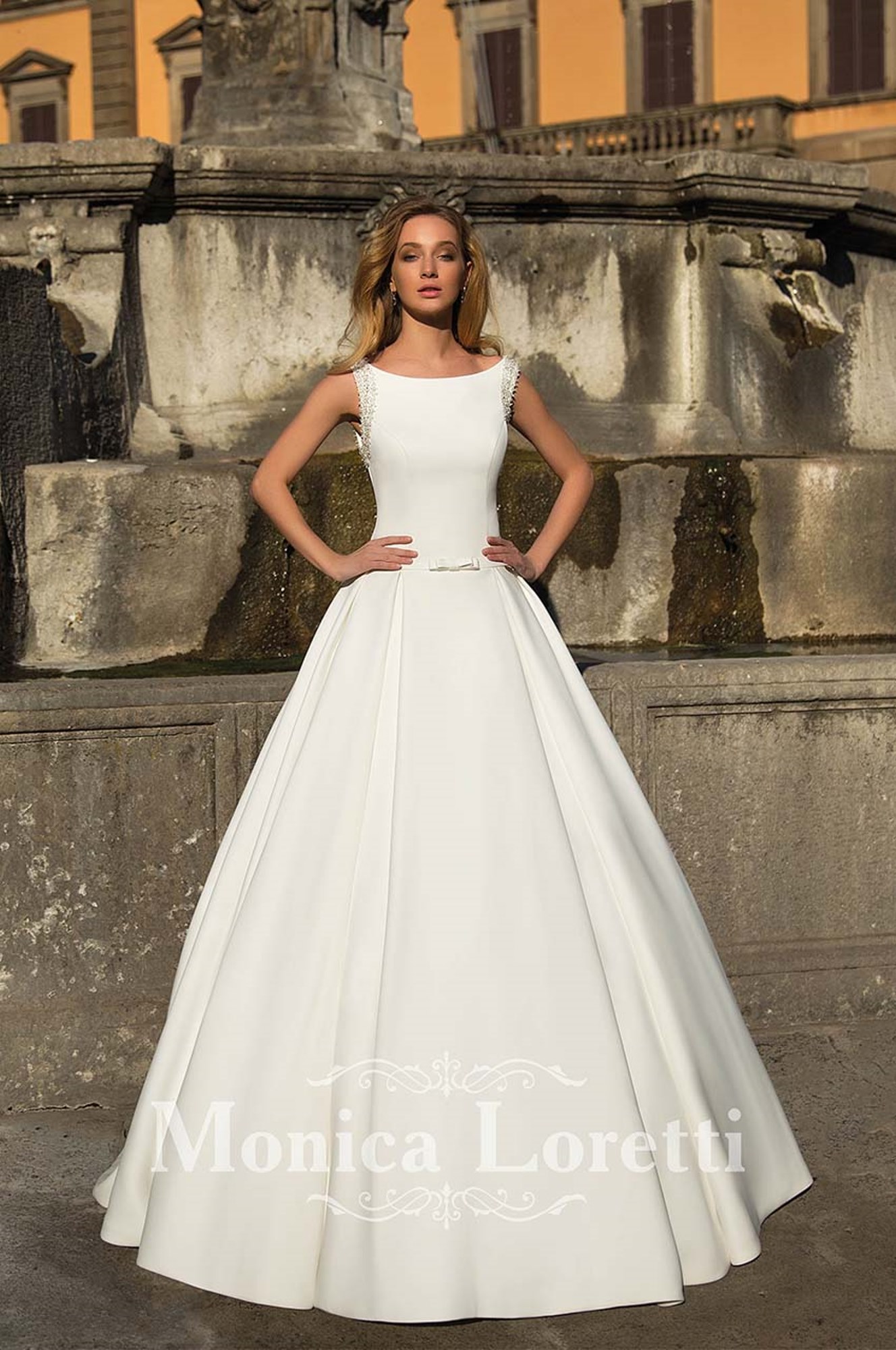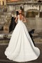 Article 4116 Classic satin gown. Romantic bateau neckline with satin sholders straps. Lavish beaded ambroidery adorns the shoulder line and U-back of this chic wedding dress. Delicate satin bow belt. Modern pockets. Elegant trail. Finished with zipper closure. Available colors: light ivory (shown) / snow white