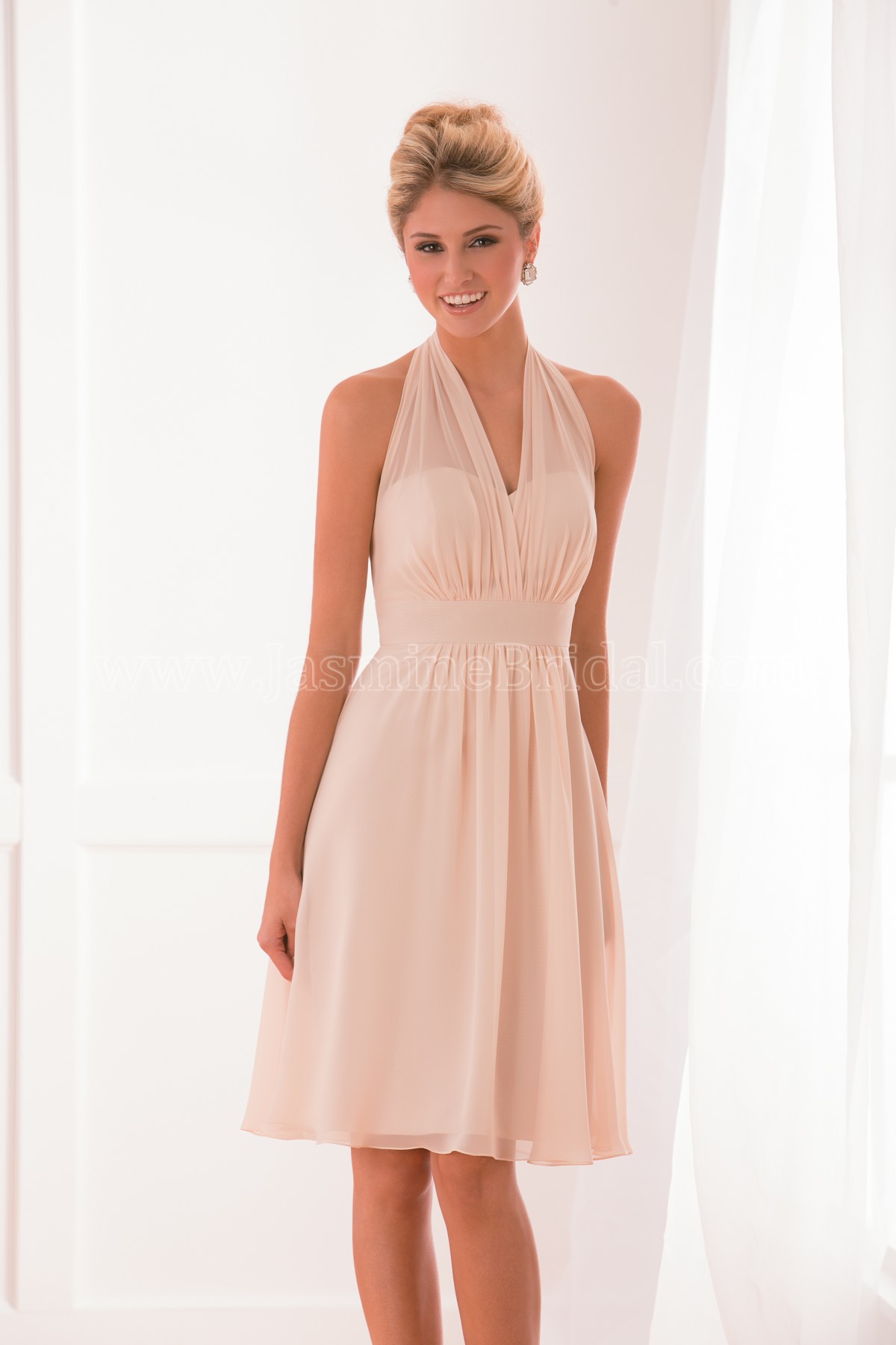 A youthful poly chiffon dress and a versatile choice for your bridesmaids. Features a halter neckline and an A-line skirt.
