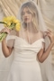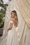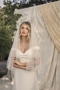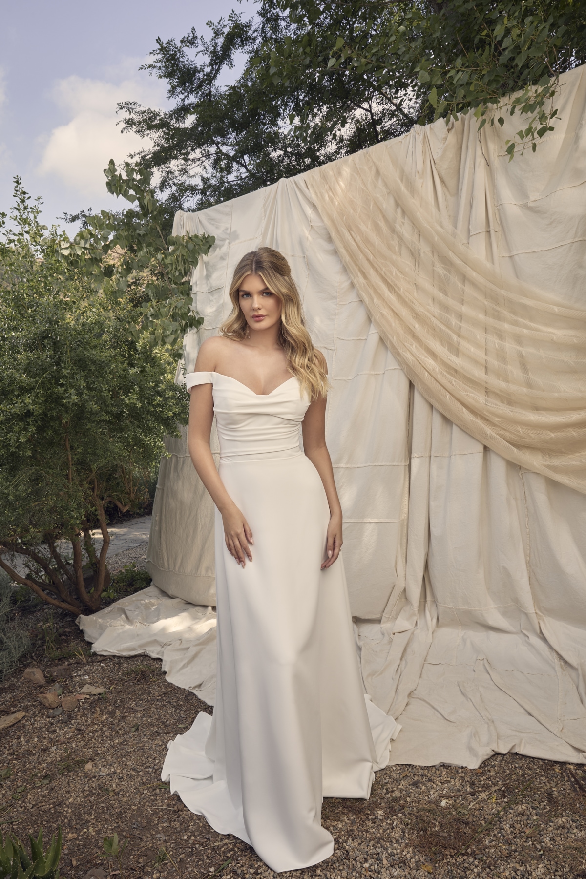 The soft murmur of the water's edge mingles with the quiet rustle of nearby trees. Baby birds chirp from a nest in the leaves, and a bride sighs with relief. BL471 Dove is as pure as her name. This gorgeous ivory wedding gown is cut in a flattering sheath silhouette with a cowl neckline and off-shoulder sleeves. At first glance, 'Dove' exudes simplicity, but as the gaze grows longer, thoughtful details are revealed. Her elegantly draped 15-point boned bodice connects in a cascading row of covered buttons in the back. Each button whispers tones of lasting love as they seem never-ending on 'Dove's' 58-inch train. As sophisticated as she is practical, this gown is crafted from soft satin and stretch chiffon, the most desired fabric for comfortability throughout a bride's big day. Complete this look with her classic 3-tiered fingertip veil, BL471V, offered separately.
