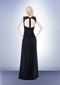 Chiffon gown with a sweetheart pleated neckline, shoulder straps tie at neck with an open key hole back. Pleated cummerbund with off-center gathers accent the skirt.