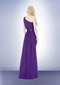 Chiffon one shoulder gown with asymmetrical ruched bodice. Attached ribbon accents the waist. Soft gathers surround the skirt. Ribbon available in select colors.
