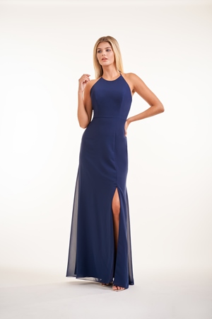 Charlotte chiffon long bridesmaid dress with halter neckline and A-line side slit skirt.