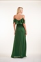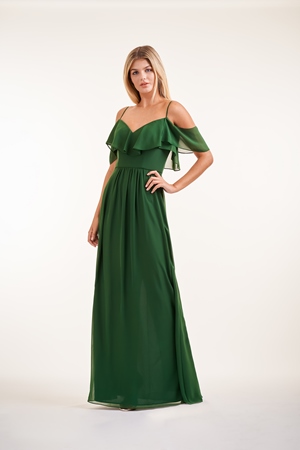 Charlotte chiffon long bridesmaid dress with ruffled V-neck, spaghetti straps, and off-the-shoulder ruffle sleeves. Beautiful flowy A-line skirt.