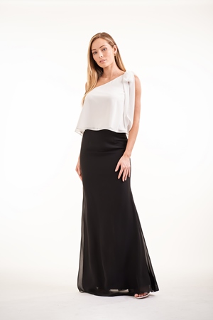 Charlotte chiffon two-piece, two-tone bridesmaid dress. One shoulder tied top with fit-and-flare skirt. Modern and can be worn again- together or as separates.