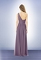 Chiffon gown with one wide shoulder strap. Ruching and pleats adorn the bodice. Front and back gathers accent the skirt.