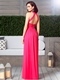 Full length lux chiffon dress w/ modified v-neck halter. Rouched bodice and midriff. Shirred skirt.