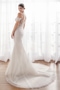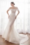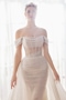 Make an unforgettable entrance in this mesmerizing mermaid gown crafted from sparkling glitter tulle. A flattering sculpted neckline elegantly frames the collarbone and is complemented by romantic draped sleeves. The softly structured corsetted bodice creates a stunning silhouette that's enhanced by a breathtaking detachable cathedral train. This stunning gown redefines bridal chic.