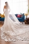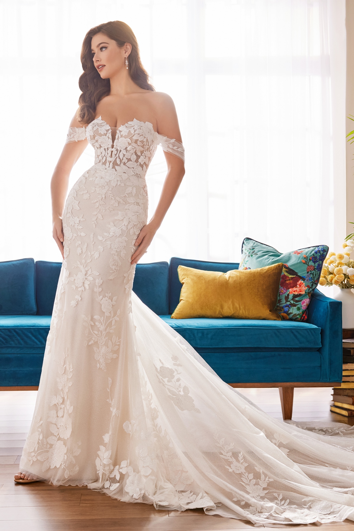 Fall in love with this impossibly romantic fit and flare gown. The illusion sweetheart neckline gracefully highlights the decolletage, while elegantly draped sleeves adorned in floral lace applique add a touch of whimsy. A breathtaking cathedral train and matching scalloped veil complete this one-of-a-kind bridal style. Matching veil MT5102VEIL sold separately.