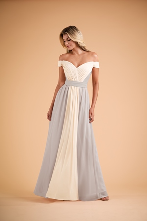 B2 SPRING 2020 - B223004 - Pretty poly chiffon long bridesmaid dress with portrait neckline and cinching waist tie. New and exciting two-tone designs offered. Gown