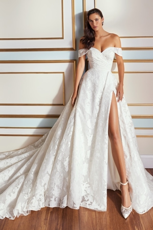 Fall head over heels for this ultra-romantic ball gown. The flattering sweetheart neckline and elegant draped sleeves gracefully highlight the decolletage, while the softly structured bodice slims and accentuates the waist. A sultry thigh split provides a touch of seduction, while an oversized bow adds refined drama to this breathtaking style.